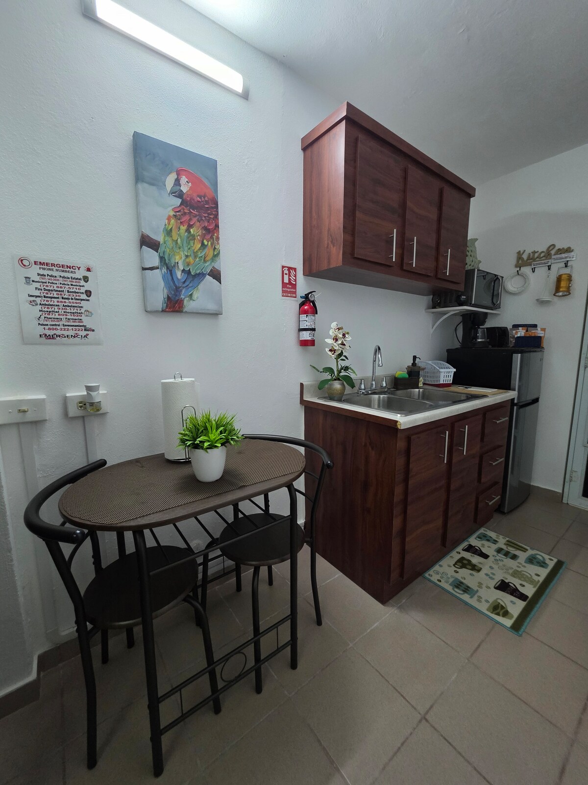Studio apartment with one full bed, and folding mattress for 2 children's , sofa refrigerator, microwave, coffee maker, toaster, eating area, includes continental breakfast, private bathroom, toilet paper, bath and hand soap, bedding, pillows, towels, Wi-Fi, television, air conditioning, carbon monoxide and smoke alarms, fire extinguisher, first aid kit, emergency plan, open terrace, basketball and tennis courts, recreational park, parking, located in an exclusive place.