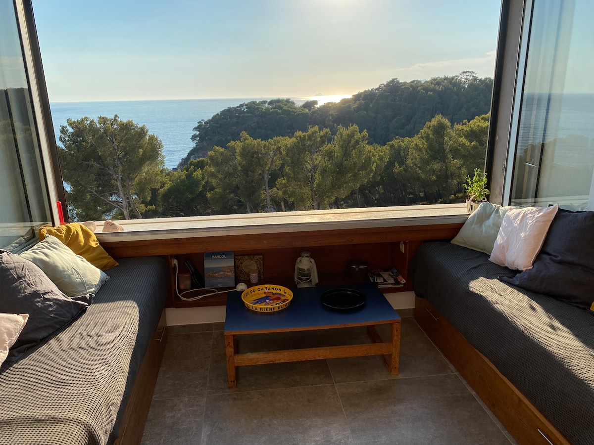 Impresionante apartamento tipo loft de unos 40 m2 con cocina integrada, nevera y lavadora, aseo independiente, cama de 160 gd confort y sofá cama, con vistas a la playa más bonita de Bandol. Excepcional vista al mar, en la playa de Renécros, puerto y centro de la ciudad a pie, plaza de aparcamiento privado con RECARGA eléctrica para coche, nuevo.