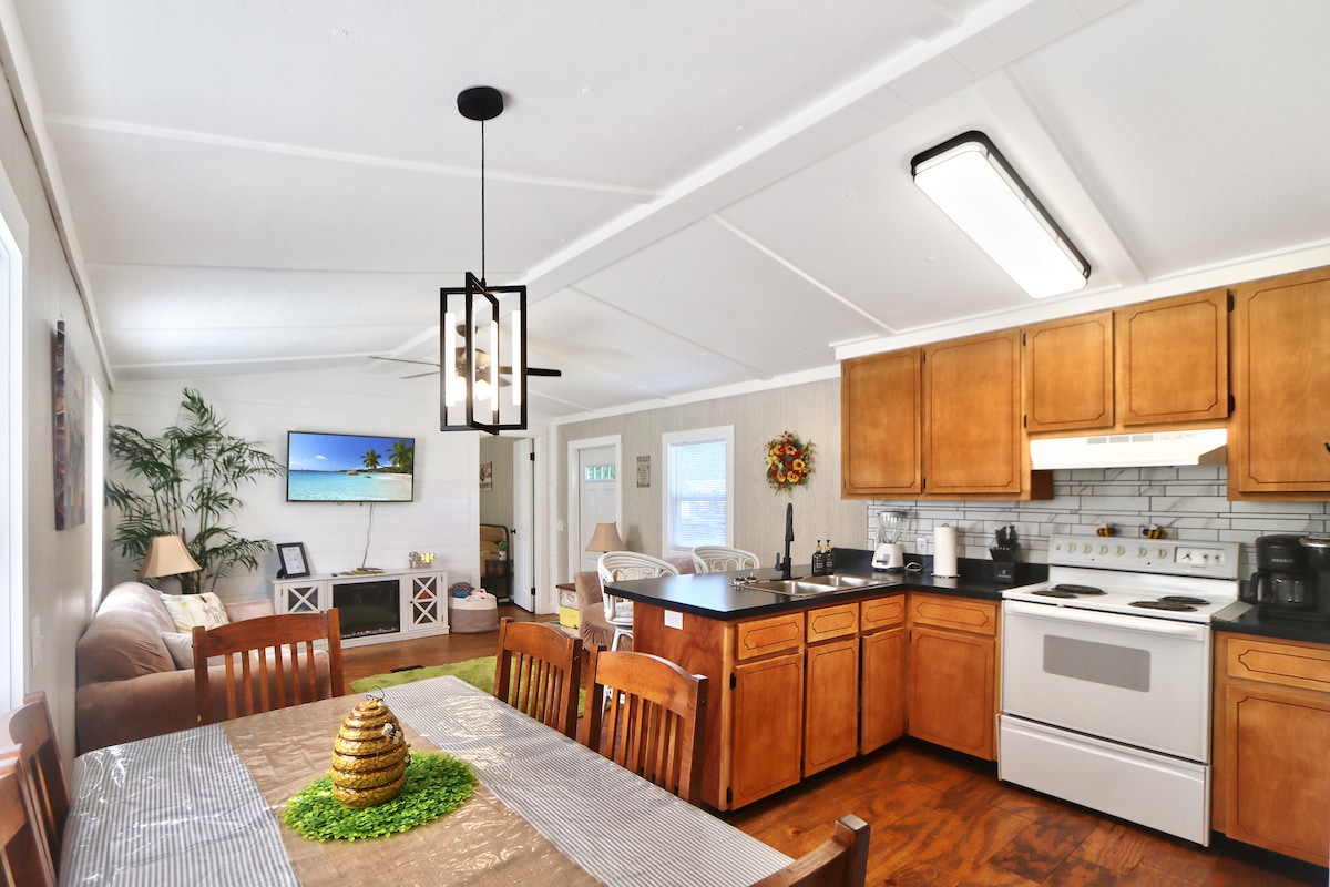 This NOT so tiny, tiny home is located across from the bay, has everything needed to enjoy your vacation. Completely remodeled in 2017. Shabby chic, beach decor, Q sized bed, 2 stuffed chairs & complete kitchen. Screened in porch, dining area, chairs. Relax with a beverage & enjoy the amazing view of the bay. Affordable small family (2 adults 1 small child) vacation or romantic getaway. Professionally cleaned after each guest stay. Bathroom is small with corner shower. Pet policy in listing