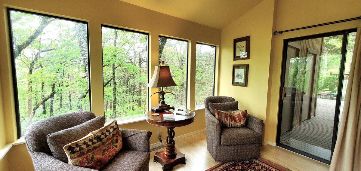Prepárate para relajarte en este alojamiento tranquilo y elegante. Situado a pocos minutos del centro histórico de Eureka Springs, este tranquilo y recién renovado refugio es el lugar perfecto para una escapada, con hermosas vistas y vida silvestre visitante. El dormitorio principal tiene una cama tamaño king, TV, un espacio de trabajo y un baño con bañera/ducha. El segundo dormitorio tiene una cama tamaño queen y TV. El espacio al aire libre tiene un pozo para hacer fogatas, un patio trasero cubierto con parrilla para barbacoa y muebles de patio. Amplio espacio de garaje disponible por un cargo adicional.