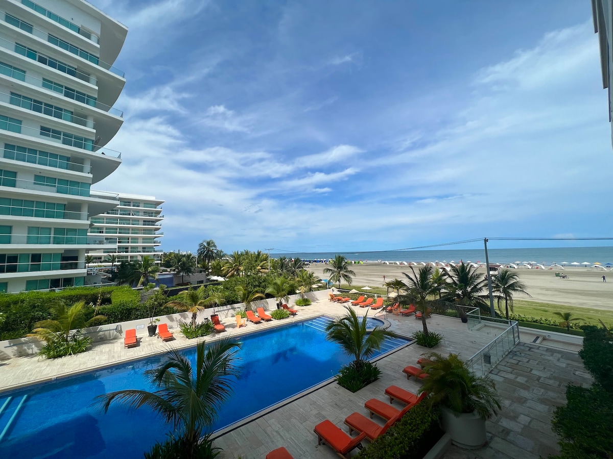 Relájate con tu familia en este lugar frente al mar. Fue equipado, pensando en el bienestar de nuestros huéspedes. Tiene 2 alcobas amplias y 2 baños con agua caliente. En la zona social hay TV y juegos de mesa como ajedrez y dominó. La cocina se encuentra equipada. Disponible lavadora/secadora. El apartamento tiene TV cable y WIFI. Contamos con piscina infinita, jacuzzis, sauna, turco, gimnasio y juegos infantiles. El edificio está a 4 min. del aeropuerto y a 1 min la Ciudad Amurallada.