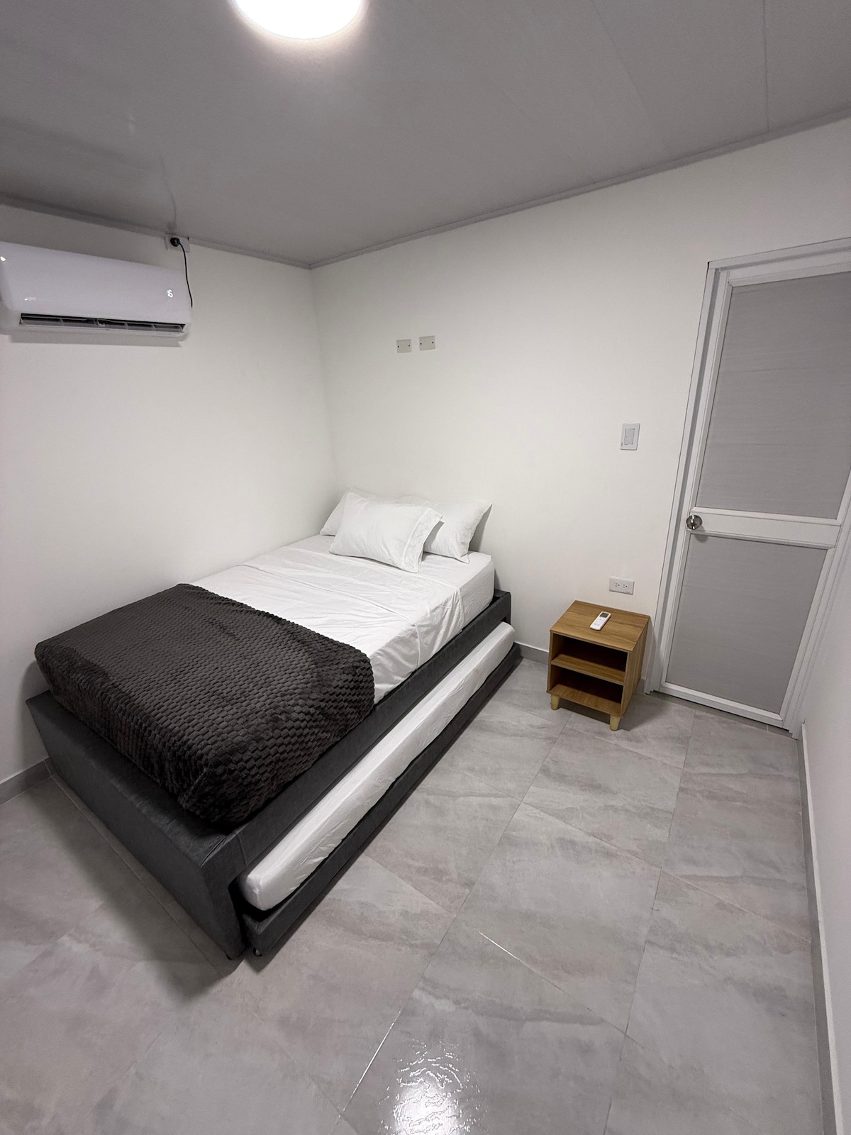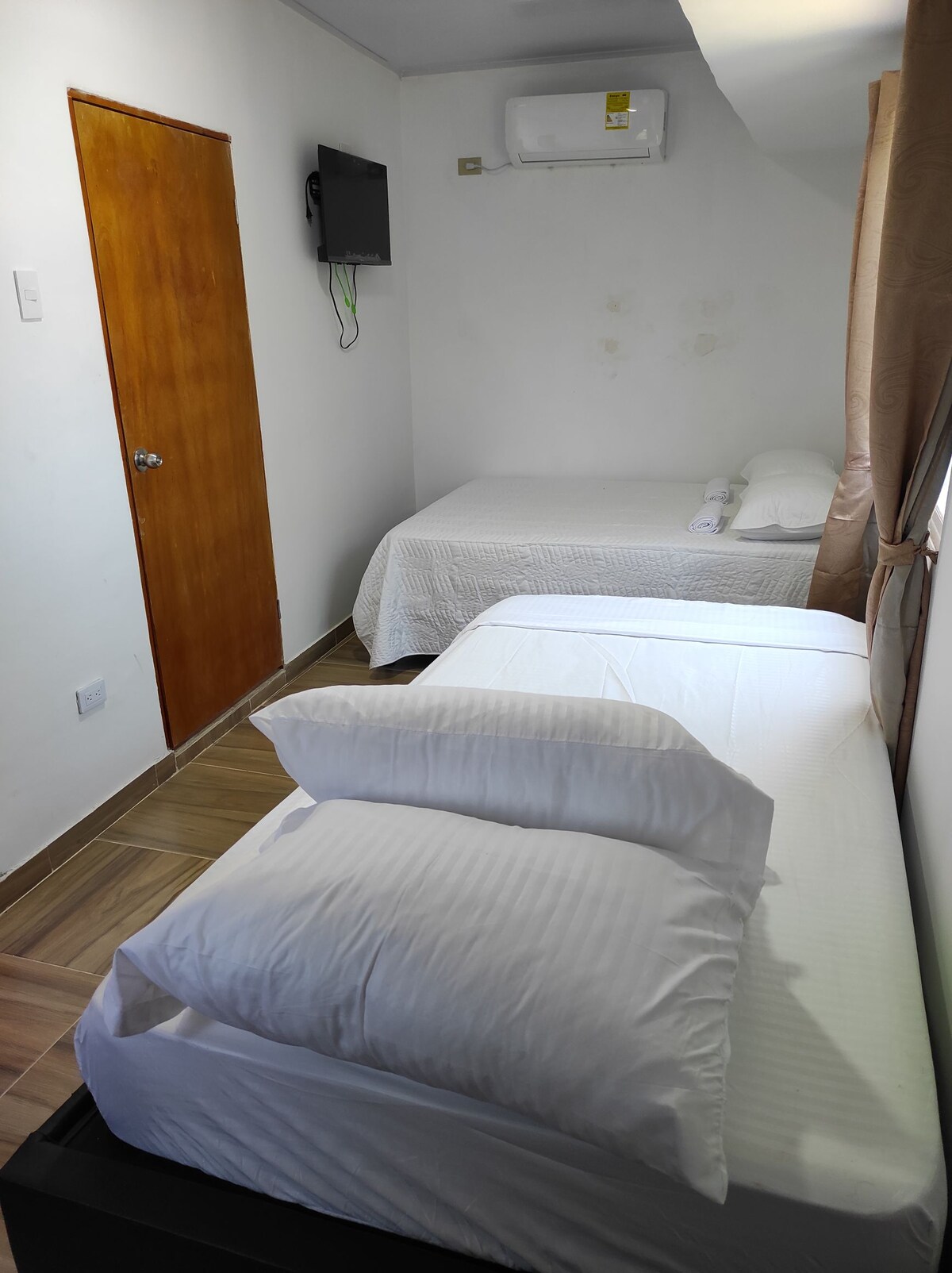 Habitación ideal para familias o grupos pequeños. Cuenta con una cómoda cama doble y una cama auxiliar individual, perfecta para un tercer huésped. Espacio moderno, con aire acondicionado, baño privado y todo lo necesario para una estadía confortable.