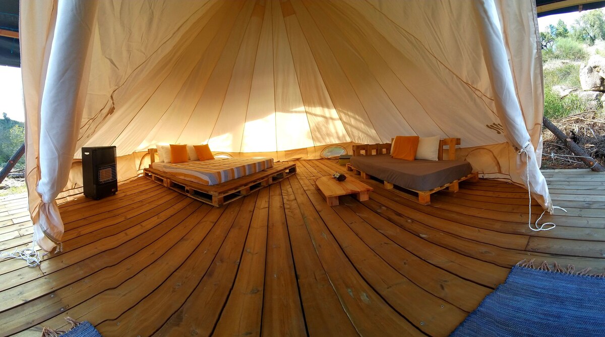 Vuelve a conectar con la naturaleza en esta escapada inolvidable. Nuestra tienda de campaña tiene vistas a la cascada en el río Ocreza. La tienda cuenta con colchones y ropa de cama. Está en una terraza y pérgola para los días soleados y lluviosos. Con una pequeña chimenea, es ideal para un acogedor camping. Para compartir tenemos una cocina para acampar, inodoros de compost, duchas exteriores, electricidad, agua, wifi y horno de pizza si el clima lo permite. Se necesitan 2 km de camino de tierra para llegar aquí, así que prepárate para una experiencia todoterreno.