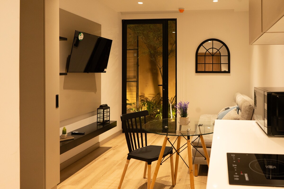 Relax in this brand new, cozy and comfortable apartment that hosts 4 guests. Start your day with a coffee on a delightful and relaxing private terrace . It has 2 spectacular master rooms with queen beds perfect to rest. The place is equipped with appliances for a unique stay; washing and dryer machines are available for you. It has an amazing location at a walking distance to the historical center. Perfect for visitors that love confort, designer style and good location.