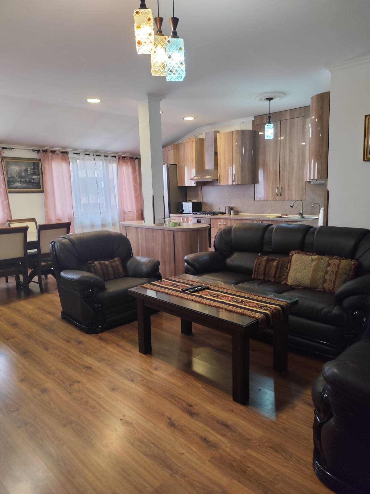 1 King size bed (180 cm wide), 2 single beds (100 cm wide) + folding sofa, 93 sq m, 12/12 floor (with elevator) new building, open balcony, coffee table, dining table for 4 persons, working table , fresh clean towels, linen, pillows, blankets, iron and hairdryer, hot water, heating system and air conditioner, fully equipped kitchen, refrigerator with freezer, washing machine, electric kettle, gas stove, oven, microwave, 3 smart TV 32” LED, cable TV, Wi-Fi. I will be glad also to offer tour activities across Armenia (like Garni, Geghard, Sevan, Dilijan, Tatev monastery, etc.), as well as car hire service. The apartment is located right next to Dalma Garden Mall and within meters of the Armenian Genocide Memorial and Museum, Yerevan Brandy Factory, and the Central Bus Station. Grand Republic Square is a 25-minute walk away. There is a bus stop just 100m away with numerous buses and micro buses to all districts of the city. Everyday cleaning included. This is a new listing. You can check the other apartments and co-host's accounts for all the reviews.