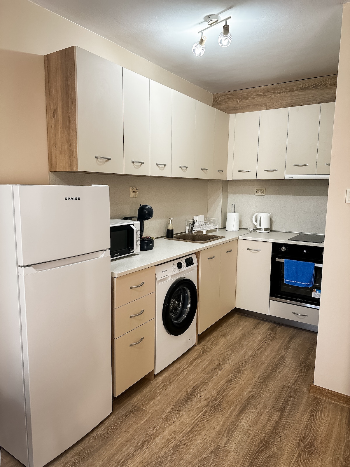 El encantador apartamento beige es perfecto para aquellos que buscan comodidad y estilo, mientras están cerca de atracciones locales, restaurantes y entretenimiento. El espacio es adecuado para viajeros solitarios, parejas o familias pequeñas. El espacio: Sala de estar cálida: - Sofá cómodo (apto para dormir para 2 personas). - Televisión inteligente - Aire acondicionado. Cocina totalmente equipada: - Frigorífico, horno, microondas, estufa. - Café de cortesía Habitación elegante: - Cama doble. - Armario - Aire acondicionado. Baño moderno: - Ducha, lavabo, inodoro. - Artículos de aseo. Estacionamiento gratuito en la calle