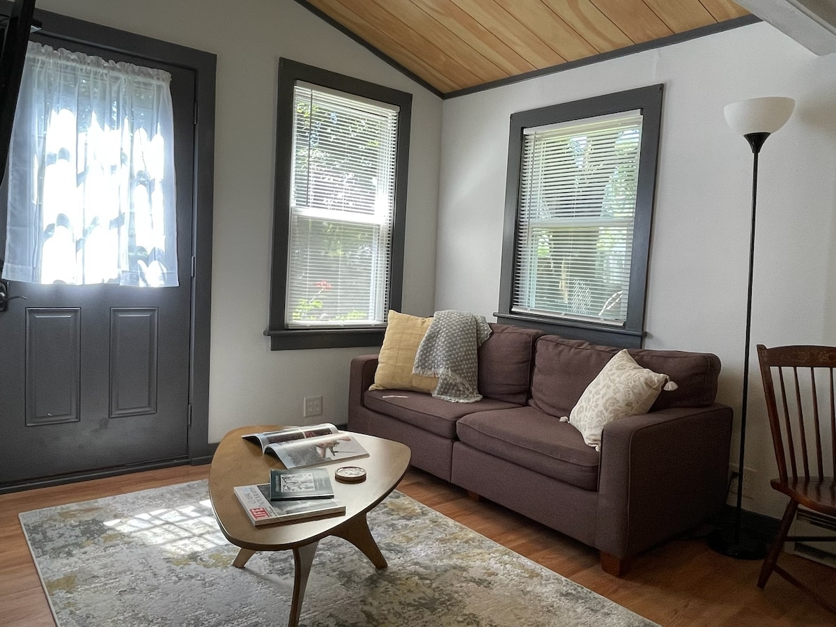Acurrúcate junto a un fuego crepitante. Come en un rincón o en un mostrador de madera rústico junto a una ventana. Esta pintoresca y caprichosa casa tiene una terraza privada con barbacoa, un jardín con hamaca y un pozo de fuego. Una cama plegable de tamaño completo con una cocina completa (excepto un horno). Tendrás acceso a toda la casa de huéspedes. A poca distancia en coche de la hermosa, ecléctica y moderna ciudad de Woodstock. Arte y cultura, restaurantes, senderismo y ciclismo, todo cerca. Calefacción eléctrica, ventilador de techo, unidad de aire acondicionado de pie y ducha para una persona.