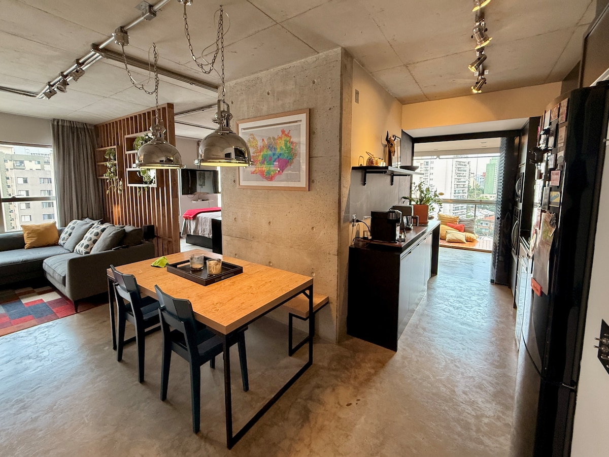 Estúdio espaçoso com muito design, arquitetura e a melhor vista de São Paulo. Loft completo! Com cama queen, closet, ar condicionado silencioso, cozinha completa, home office, WI-FI, TV 55” e uma belíssima banheira de imersão, de onde pode apreciar o seu drink preferido e curtir uma vista apaixonante. São Paulo toda estará há poucos minutos de você. Acesse o metrô andando apenas 200m. Reserve com tranquilidade! Proporcionaremos uma excelente hospedagem e uma ótima experiência!