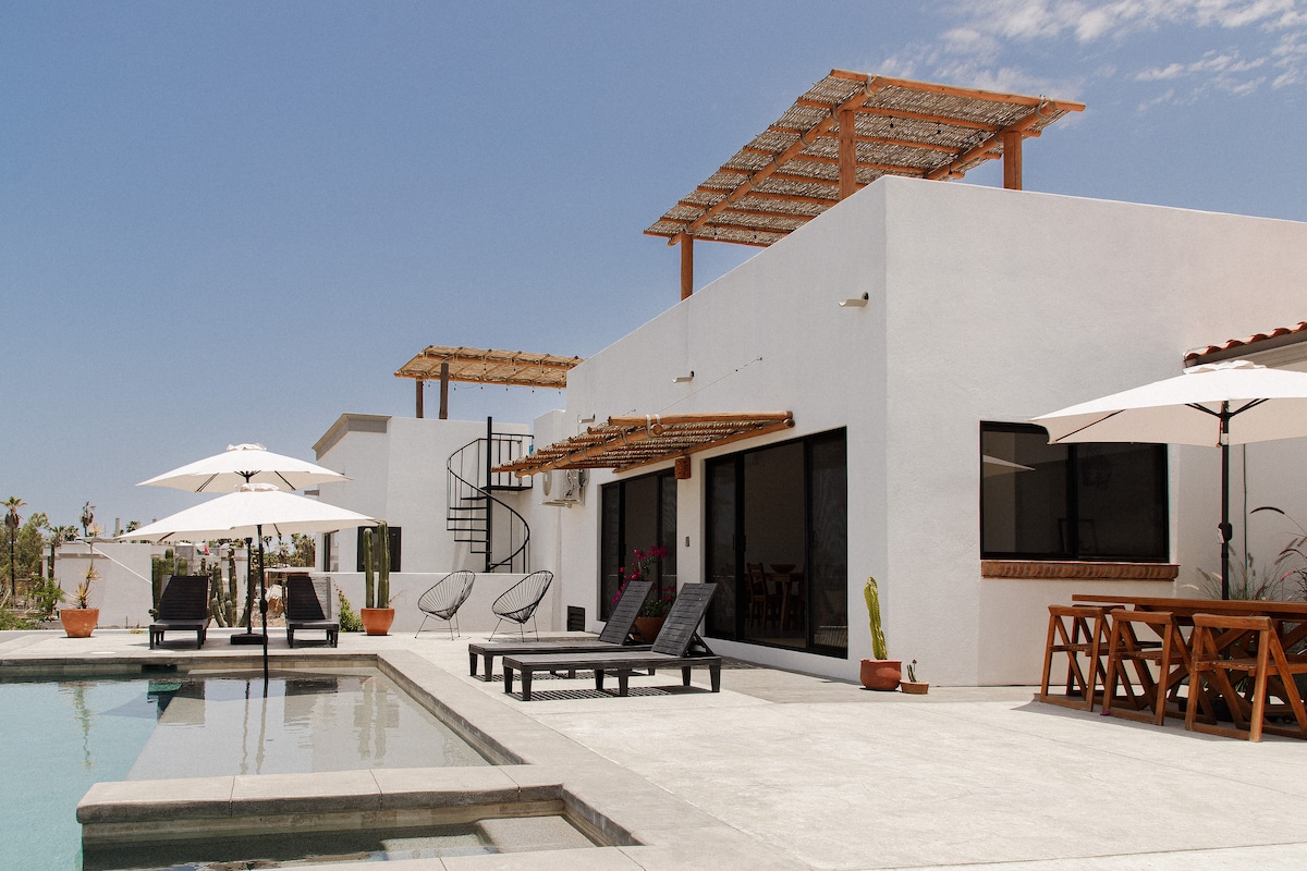 A brand new Spanish style casa offering 1,400 sq. ft. of one-level living with the desert and ocean symphony all around. This 2 bedroom + 2 bathroom home is nestled in the cozy neighborhood of Las Tunas -- close to the Pacific Ocean as well as the urban center of Todos Santos. Casa Suerte offers rooftop ocean views, glowing sunsets, walkability to local restaurants and a secluded beach, a large private swimming pool with tanning shelf, AC, and a comfortable indoor/outdoor living experience.