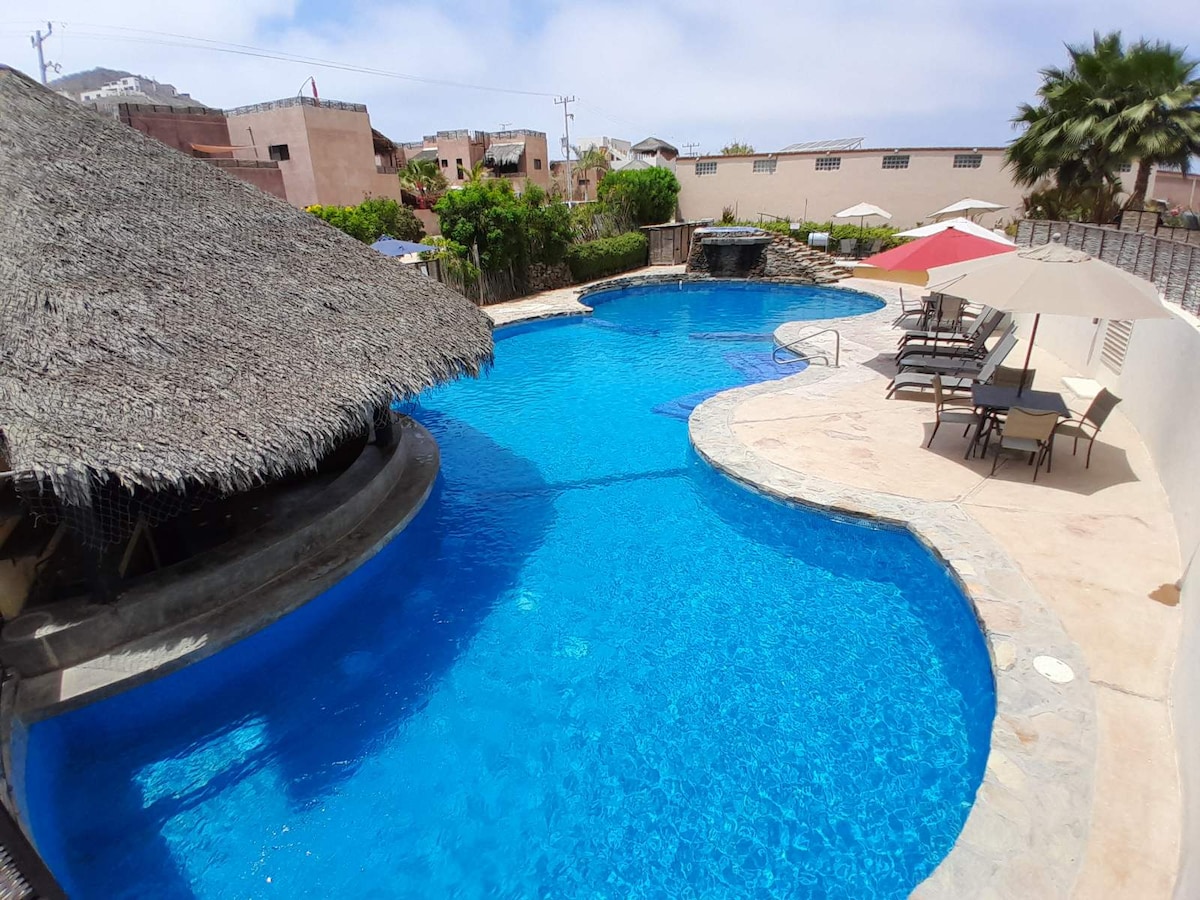 ¡Te damos la bienvenida a Villas del Scarlet Cardones! Retírate a nuestro tranquilo condominio en la planta baja en el corazón de Cerritos. ¡Esta es la única playa para nadar al norte de Cabo en el Pacífico! Disfruta de las vistas al mar y la increíble cordillera Sierra de la Laguna desde la propiedad en tu propio balcón en la azotea. El condominio está a 2 minutos a pie de la playa, restaurantes y bares. Estamos ubicados alrededor de 1 hora de Cabo y a solo 7 kilómetros de Todos Santos. Aire acondicionado, piscina, bañera de hidromasaje, zona de parrilla exterior y WIFI.