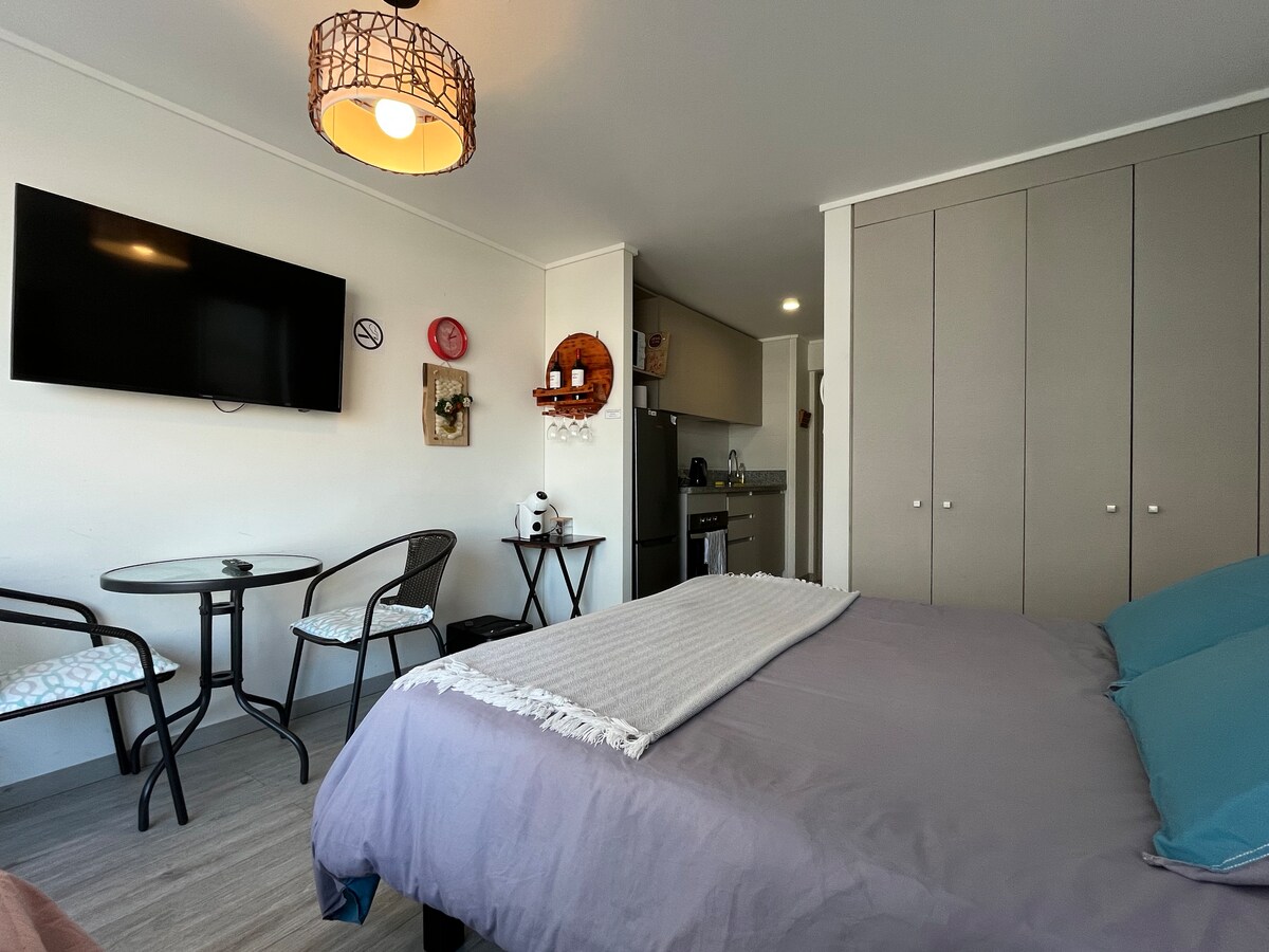 Te invitamos a disfrutar de la calidez y confort de nuestro alojamiento, el cual se encuentra cómodamente acondicionado para dos personas, a pasos de avenidas con relevancia comercial, supermercados, clínicas, lugares de esparcimiento , estadio, parques y plazas. Disponemos del siguiente equipamiento: Electrodomésticos y elementos de cocina básicos esenciales, Dormitorio totalmente equipado, toallas y otros. Ideal para Home Office. ¡Ven a disfrutar, te esperamos!