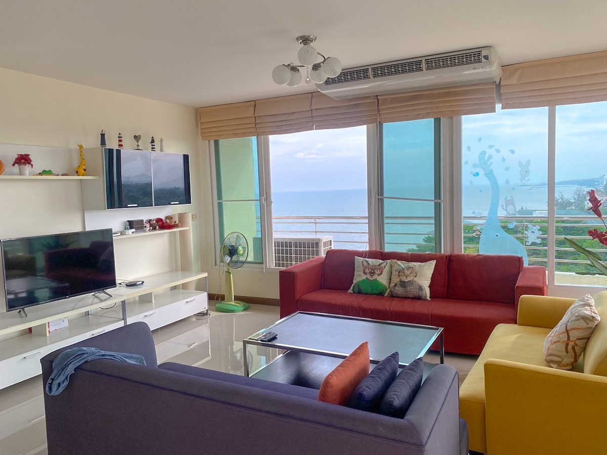 Disfruta de unas tranquilas vacaciones privadas frente a la playa con espacios en el último piso de 105 metros cuadrados. - Relájate con espectaculares vistas al mar en Cha am, Tailandia. Las comodidades incluyen una playa privada, 2 piscinas públicas, sauna, oficina principal, lavandería, servicios de limpieza, masaje TAILANDÉS, wifi, seguridad las 24 horas, gimnasio y un hermoso jardín. A 20 km de Hua Hin y a 2,5 horas en coche de Bangkok. Opciones perfectas para parejas, familias o grupos de amigos que buscan una escapada relajante.👍🏻