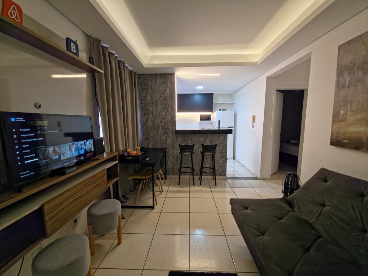Apartamento nuevo y recién decorado. Espacio moderno y acogedor con 50 m distribuidos en 2 dormitorios, 1 baño, sala de estar y cocina gourmet. Alojamiento con ropa de cama y toallas incluidas (esterilizadas); Ropa de cama estándar de hotel, utensilios premium Tramontina y equipos nuevos. Armarios a medida en todo el apartamento. Proyecto de iluminación profesional. También cuenta con pista, parques infantiles, zona de fitness, zona gourmet.