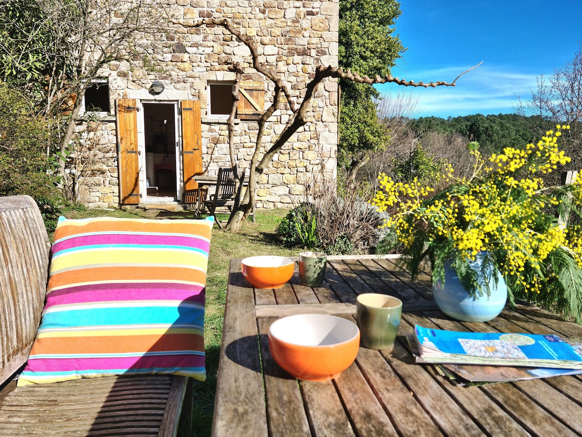 Idealmente situado para relajarse en contacto con una naturaleza preservada del ruido y el bullicio Disfrutará de un impresionante panorama de 180°grados con vistas a las estribaciones de las Cévennes y la pequeña ciudad de Vans Dentro de este antiguo edificio de Ardèche, hemos organizado con gran cuidado este estudio de 25 m² (más un altillo) con materiales de origen biológico. Goza de su entrada independiente y de un amplio espacio donde aparcar el vehículo.