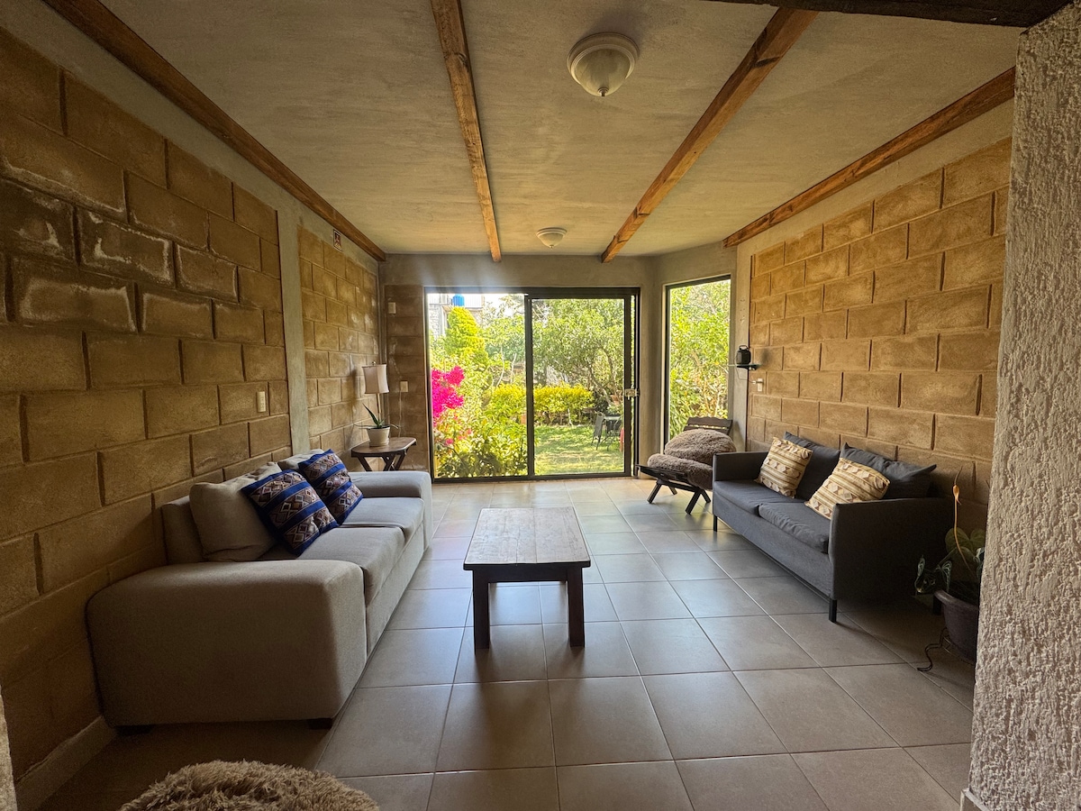 Cabaña con mucha luz del sol, muy tranquila y perfecta para descansar. Rodeada de jardines y una huerta agroecológica con árboles frutales, gallinas y conejos. Siente los aromas de flores, camina y disfruta los jardines y huerta. La cabaña se ubica en nuestra propiedad y comparte espacios con la Casa azul. Tiene una vista espectacular de las montañas y la ciudad. Ubicada en un barrio tradicional de San Cristóbal, a 5 minutos en auto y 15-20 minutos caminando del centro de la ciudad. Facturamos