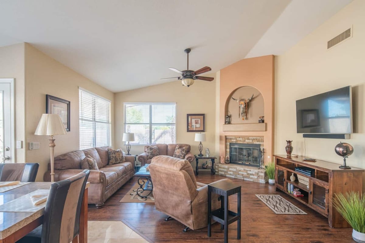 ¡Escápate a nuestra impresionante casa en el corazón de Chandler! Este refugio de 3 dormitorios y 3 baños es ideal para familias, parejas o amigos que buscan explorar la zona de Phoenix. La cocina totalmente equipada satisface las necesidades culinarias, mientras que el patio trasero presenta un verdadero oasis. Sumérgete en la piscina privada, relájate en el jacuzzi o en la sauna y reúnete junto a la acogedora chimenea. El patio cubierto es perfecto para comer al aire libre, completo con parrilla para barbacoa. Experimenta la combinación perfecta de comodidad y lujo. ¡Reserva ahora para una estancia inolvidable!