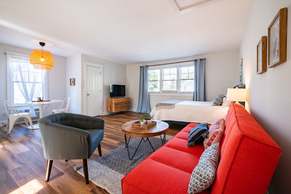 Este elegante estudio está a 5 minutos en auto del centro de Carrboro y Chapel Hill. Las casas adosadas de Weatherhill están aisladas y tienen fácil estacionamiento. Hay una cama tamaño king para la máxima comodidad y el sofá puede alojar a un huésped adicional si es necesario. ¡Disfruta de la cocina y de tener un baño solo para ti solo! Esta unidad privada del sótano tiene vistas al bosque, lo que ofrece una hermosa vista en cualquier época del año. Con ese fin, recuerda traer una computadora portátil si quieres tiempo de pantalla (no hay televisión aquí, ¡pero hay internet privado!).