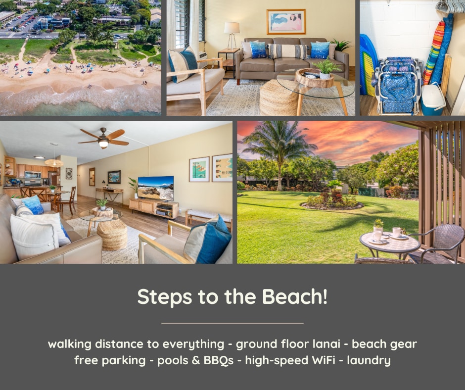 Say aloha to this beautiful beach side retreat in easygoing Kihei! It's across the street from some of the worlds most famous beaches. Beautiful completely renovated mineral pool and grill area. Everything is in walking distance, restaurants, grocery stores, and surfing lessons. We provide beach chairs, beach umbrellas, coolers, beach towels, there is NO snorkel gear.