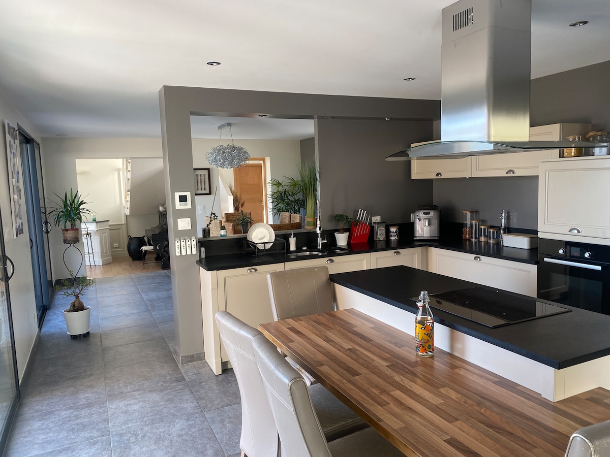 Casa rural Laitería es un 6/8 plazas Está situado en nuestra granja con vistas a la campiña angevina y a la estabulación (lugar de vida de las vacas) Una sala de estar de 40 m² sala de estar/comedor/cocina totalmente equipada, nevera/congelador, placa de inducción, hervidor de agua, cafetera combinada PROLINA . Un cuarto de baño e inodoro separado En la planta superior 2 dormitorios, el primero con una cama de 160x200 y una cama de 90x190. La 2.ª habitación tiene 3 camas de 90x190. Se pueden juntar dos camas. Un BZ de 160x200 sujeto a condición