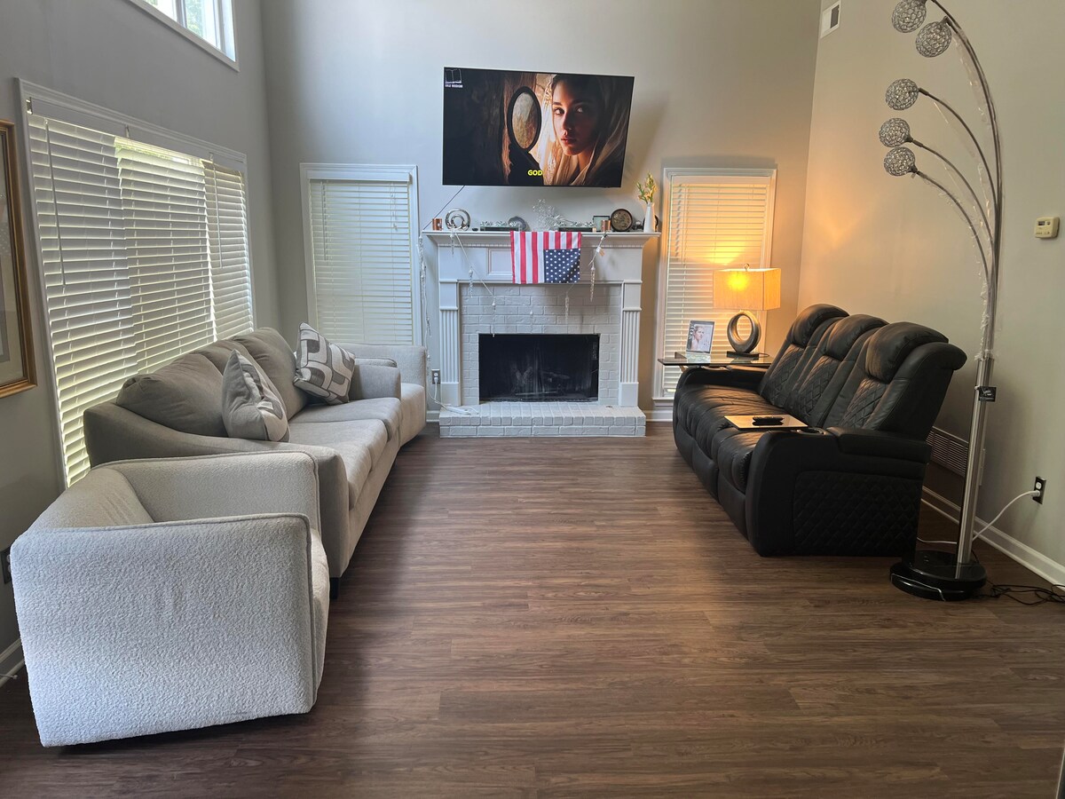 Casa familiar de lujo: 6 camas, 3 King, 1 Twin, 1 Queen extraíble, 1 Queen inflable en cualquier lugar para 12 personas. Acceso a toda la casa, 4 plazas de aparcamiento gratuitas. No se alojan otros huéspedes en el alojamiento. ALOJAMIENTO COMPLETO POR EL PRECIO DE UNA BUENA HABITACIÓN DE HOTEL. Se admiten mascotas, muchas áreas valladas al aire libre para que las mascotas y los niños exploren y jueguen. Ubicado cerca de centros comerciales, rafting, paseos en globo, senderismo y rutas en bicicleta. Braves, Falcons, fútbol, Copa Mundial 2026. Los mejores de la nación en seguridad familiar.