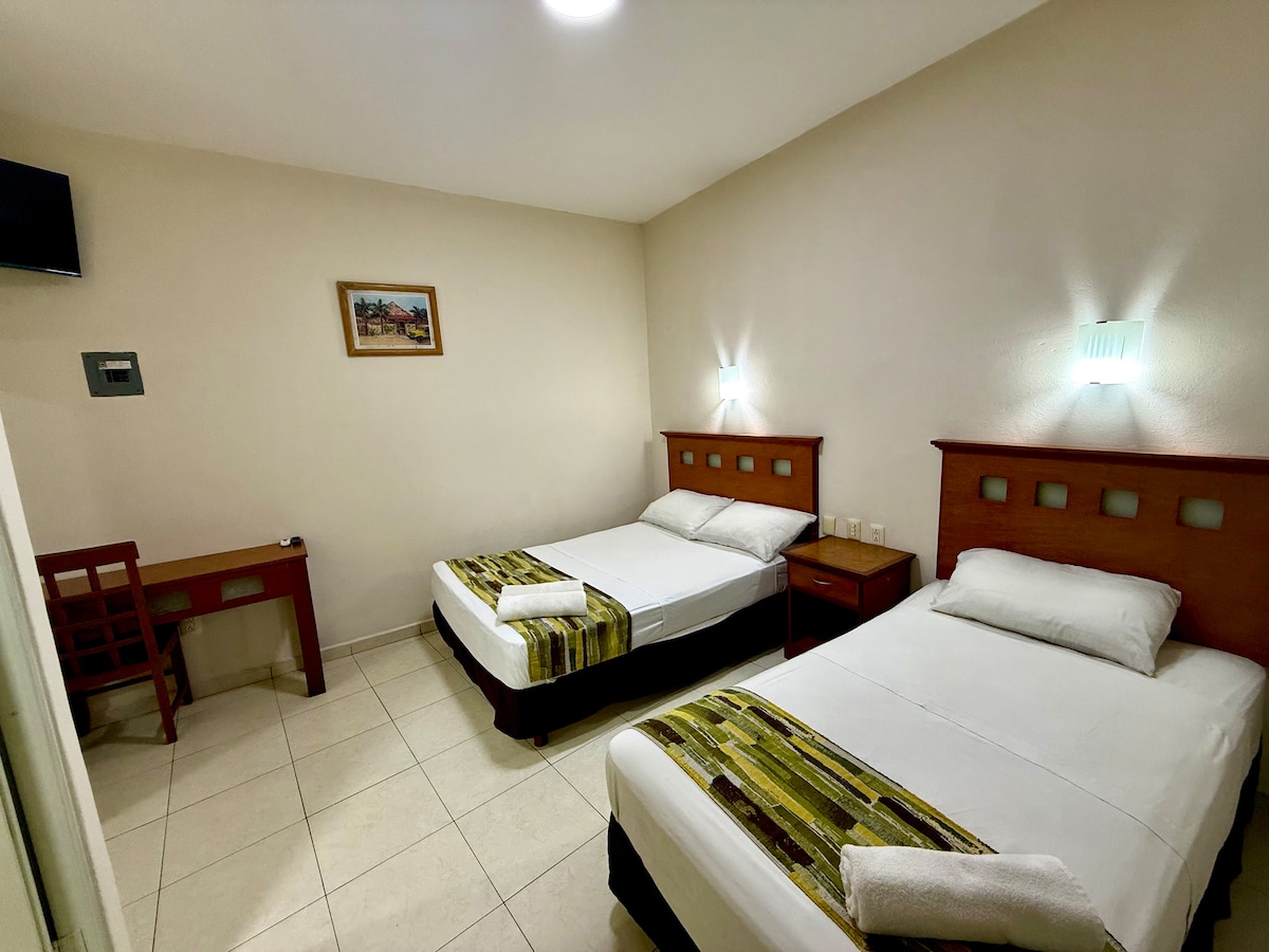 Alojamiento con ubicación excelente céntrica, contarás con Aire acondicionado, cama tamaño Queen, agua caliente, wifi fibra óptica....fácil acceso a taxis, restaurantes, farmacias, lavandería, hospitales, abarrotes . todo a unos cuantos pasos....a 6 min del Aeropuerto y terminal ADO. ubicado en Avenida principal (puede haber ruido de tráfico)