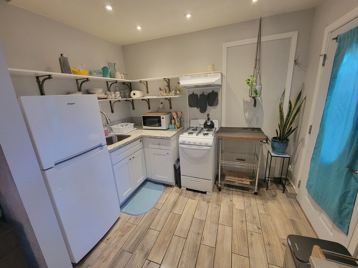 Recientemente convertimos nuestro garaje en un hermoso apartamento tipo estudio. Equipamos la unidad con un televisor de pantalla plana de 50 pulgadas, paquete de cable completo, barra de sonido Bose/altavoz Bluetooth, Internet de alta velocidad, ducha a ras de suelo con dos cabezales de ducha y un asiento, cocina completa con estufa de gas, dormitorio con cama tamaño queen, sala de estar con sofá cama, patio privado vallado con chimenea, aparcamiento fuera de la calle a 30 pies de la puerta y todo lo que necesitas para una noche tranquila y agradable o una escapada de fin de semana. Se admiten mascotas.