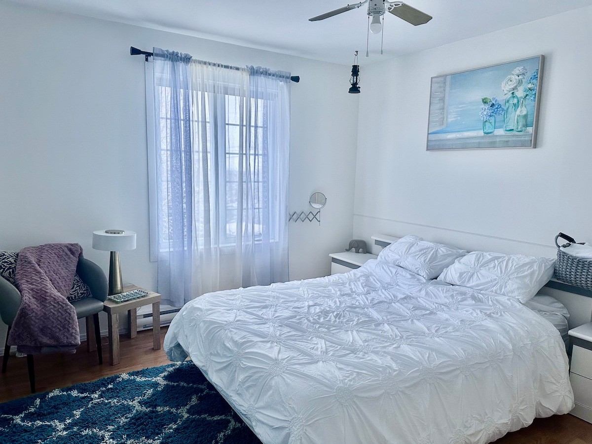 Apartamento muy espacioso con impresionantes vistas al majestuoso río Saguenay. Uno de los dos dormitorios tiene una cama doble, el segundo tiene dos camas dobles y la sala de estar incluye un sofá cama para huéspedes adicionales. Este alojamiento es ideal para recibir a dos parejas y un huésped adicional. Convenientemente ubicado cerca del centro de Chicoutimi y a solo 2 minutos a pie de una tienda de comestibles.