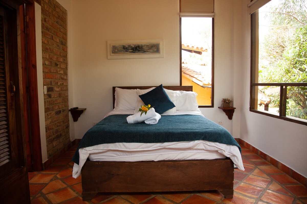 Villa de los Juanes es un refugio perfecto para relajarse y conectarse con la naturaleza. Nuestra casa te ofrece dos habitaciones independientes con camas dobles, comedor, baño, estudio de trabajo, cocina equipada, patio al aire libre, BBQ, Jacuzzi, estacionamiento privado y 3.400 mts de espacio verde. Brindamos wifi rápido , televisión, libros y juegos de mesa. Déjate encantar por la paz que se inspira este hermoso lugar. A sólo 10 minutos en carro de Villa de Leyva (5 km).