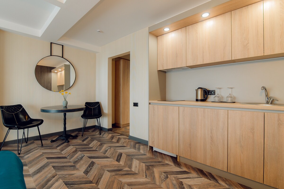Experience comfort and elegance in this 100 sqm, 2-bedroom apartment located on the 8th with elevator access. Perfectly suited for families, business travelers, or groups seeking a stylish and relaxing stay in Chișinău. Enjoy your own private sauna—a unique feature that adds a touch of luxury to your visit. The apartment includes a living room furnished with a comfortable sofa, ideal for relaxing. A dedicated workspace is also available, making it easy to stay productive while away from home.