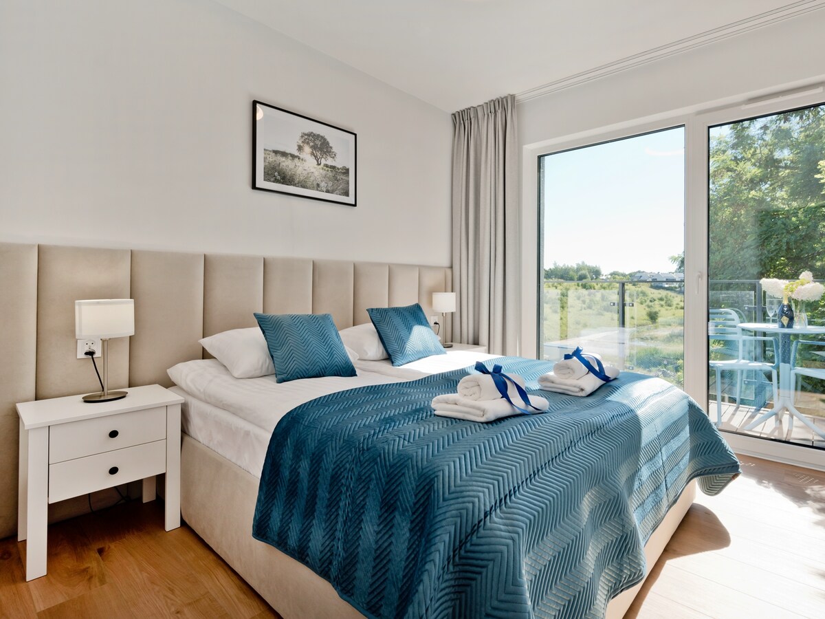 Luksusowy apartament na 2 piętrze z balkonem, zlokalizowany zaledwie kilka kroków od plaży nad Zatoką Pucką - jednego z najlepszych w Europie miejsc do uprawiania sportów wodnych oraz tras rowerowych, które ciągną się od końca Półwyspu Helskiego, aż do Trójmiasta. W parku przy samym obiekcie dostępny jest nowy, ogrodzony plac zabaw dla dzieci. Do dyspozycji dla gości jest takze strefa SPA z dwoma saunami i strefą wypoczynku.