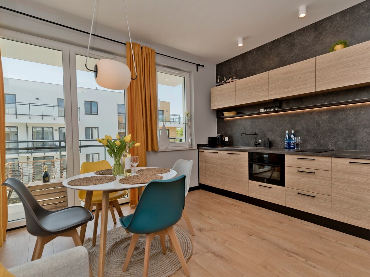 Apartment situated ca. 1,5 km away from the beautiful beach of Brzezno, ca. 1,6 km from Energa Stadium, ca. 6 km from Old Town Gdansk and ca. 4,2 km from Oliwa Archcathedral. Newly-built object consists 3 buildings, that allow a shared use of a gym, sauna, playroom for children. Playground outside. Private parking. Malls nearby. Apartment 54 m^2 + terrace. Separate bedroom. Kitchen combination with living room. Apartment recommended to demanding guests, excellent location.