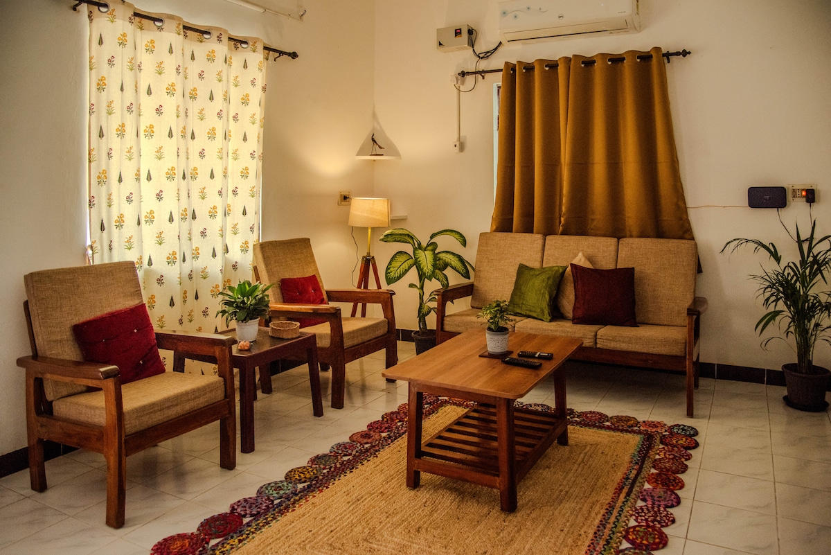 Retrocede en el tiempo y experimenta el encanto de una casa de Chennai de la década de 1990 en Mama Rose. Este refugio de 2 dormitorios combina elementos tradicionales, como un molinillo de piedra y ollas de barro, con comodidades modernas como wifi de alta velocidad, TV inteligente con suscripciones Ott y lavadora-secadora. Este alojamiento incluye el primer piso de nuestra casa, con entrada independiente y patio para disfrutar de la brisa fresca de la noche. La exuberante vegetación rodea la propiedad, con plátano, guayaba y manzanos de natillas que agregan tranquilidad.