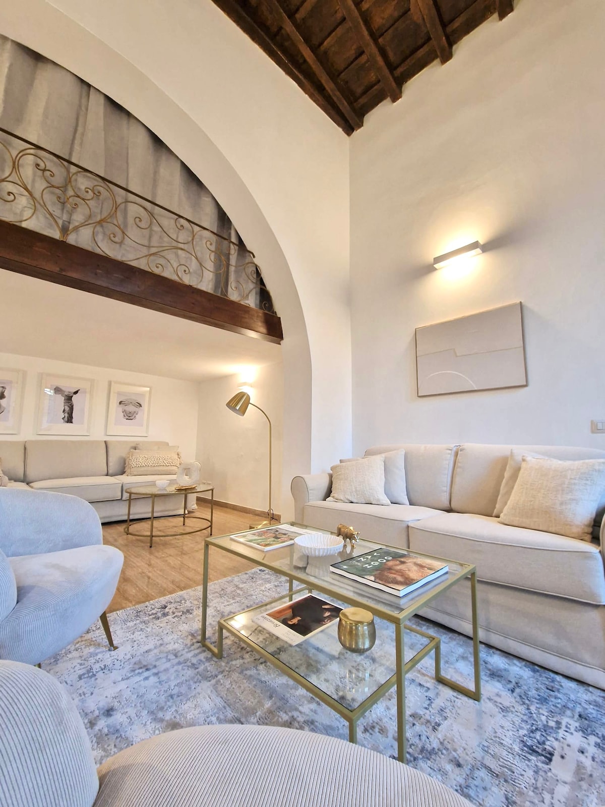 Spacious apartment, elegantly furnished and equipped with all comforts, located in a 17th-century building that hosted Liz Taylor and Richard Burton during the filming of Cleopatra. The apartment's location ie in the heart of Trastevere in the quietest and most characteristic part of the neighborhood, and close to all the places of artistic and cultural interest. It is located a few steps from John Cabot University.