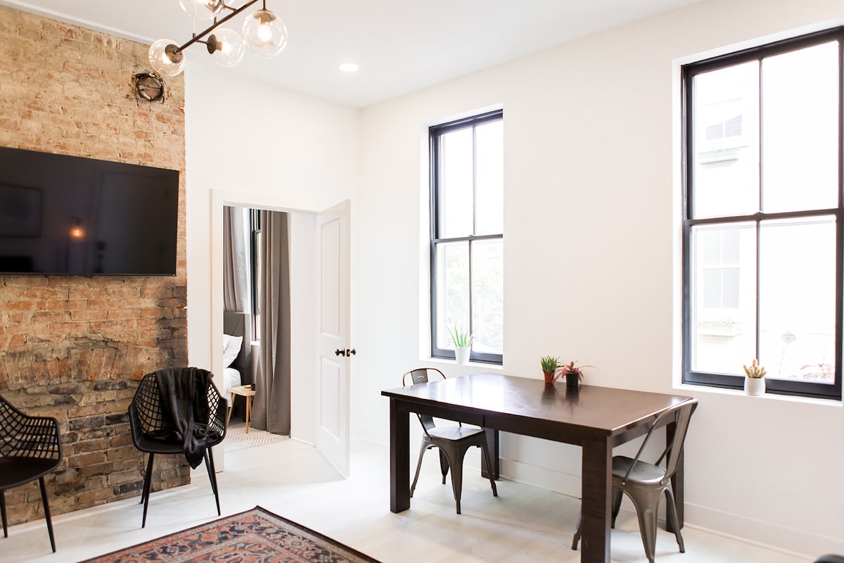 Estilo loft, unidad a nivel de la calle enfrente del histórico Findlay Market. Parada 12 en el Cincinnati Bell Connector *GRATUITO*. Capacidad para 6 personas. 1 cama tamaño king en el loft para dormir, 1 cama plegable de tamaño completo y 1 sofá cama tamaño queen, ¡perfecto para familias! A poca distancia a pie de los mejores lugares de OTR, o aprovecha la cocina completa y ve de compras al Findlay Market. Una pared de ventanas llena la unidad de luz natural, ya que el tinte solar mantiene la privacidad y la película 3M garantiza la seguridad.