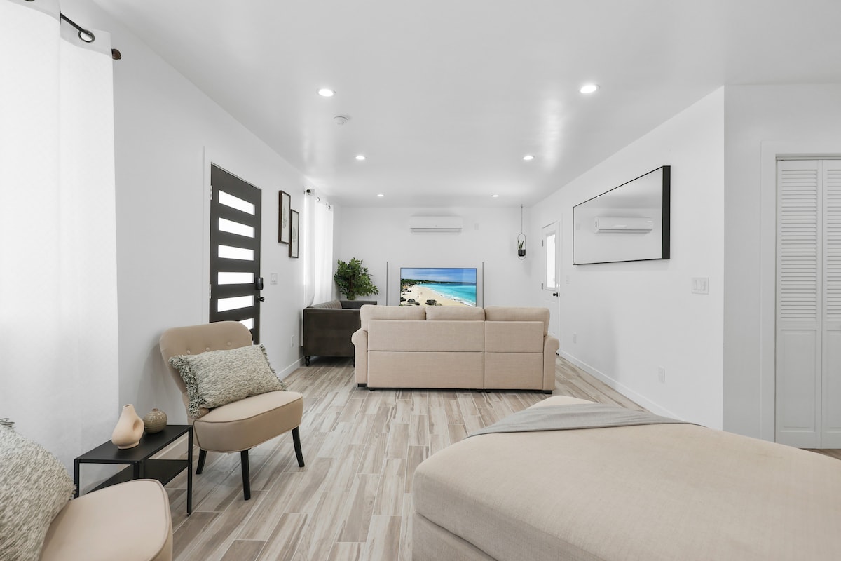 ¡Perfecto para un grupo de 4! Nuestro acogedor alojamiento céntrico ofrece una entrada privada, una cómoda sala de estar, un dormitorio, un baño completo y un estacionamiento reservado en la entrada. Conducción rápida a la emoción (aprox., tráfico ligero): • LAX, Crypto Arena, Downtown LA, Dodgers, Angeles y SoFi Stadium: ~35 min • Disneyland y Knott's Berry Farm: ~20 minutos • Universal Studios Hollywood, Paseo de la Fama de Hollywood, Observatorio Griffith: ~45 minutos • Hermosas playas y rutas de senderismo a ~15 millas. ¡Que comience la aventura! 🌴🎢
