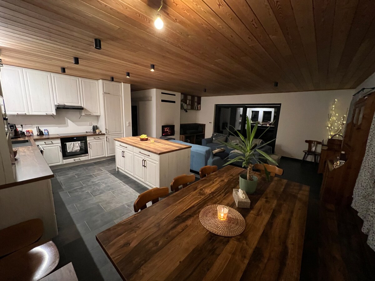 El chalet de nueva construcción en madera se completó con gran atención al detalle en marzo de 2024. Fue construido en un estilo moderno y cumple con los más altos estándares energéticos. El camino desde la plaza de aparcamiento privada, a través de la casa, hasta el porche cubierto con un nuevo jacuzzi eléctrico se ha diseñado a nivel del suelo. En el interior se puede estar cómodo con la estufa de leña y la sauna privada (gratuita). La ruta ciclista del parque nacional y las hermosas rutas de senderismo se encuentran a poca distancia a pie.