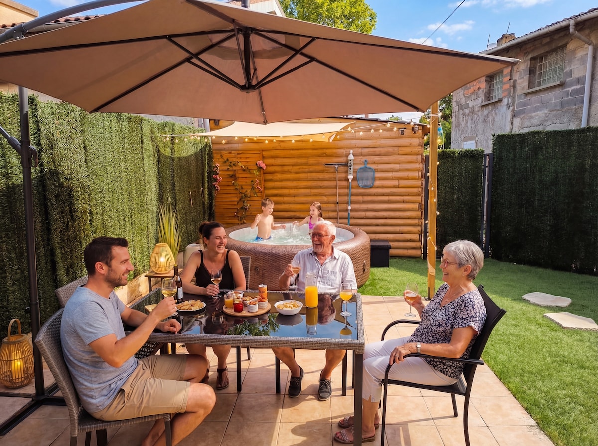 Maison lumineuse et calme avec spa privé dans patio, idéale pour se détendre après une journée de visite. Grande pièce de vie ouverte sur cour intérieure. Emplacement pratique : boulangerie dans la rue, commerces et centre commercial à proximité, nombreux lieux accessibles à pied. Gare SNCF proche et centre-ville de Clermont rapidement accessible en bus (ligne B). Parfait pour séjour détente, pro, couple ou famille.