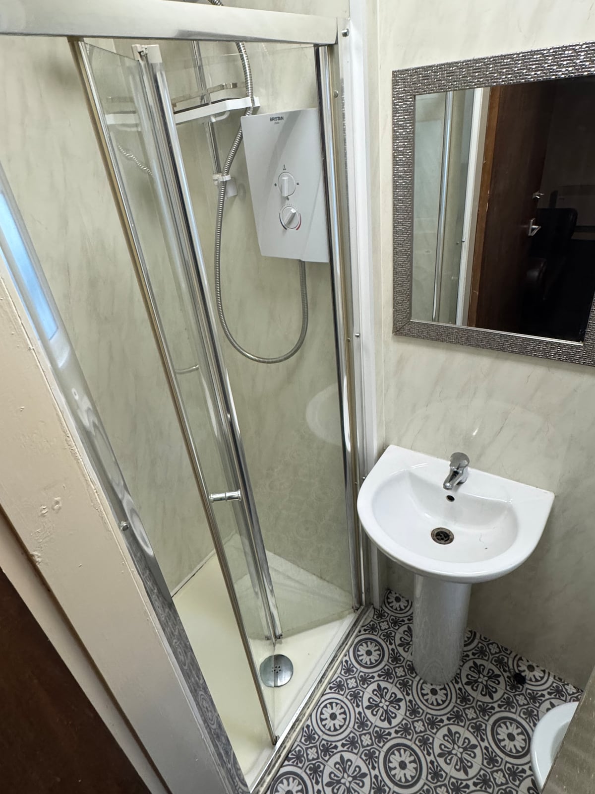 Apartment 4 is a newly renovated (Jan. 2019) one room flat let with Kitchen area, with full size cooker, fridge & microwave. The studio has a double divan bed, washbasin, own private toilet and shower. Flat screen 32" Smart TV provided. Electric is by coin meter. Location: First Floor, Side. This unit will sleep 2 people maximum.