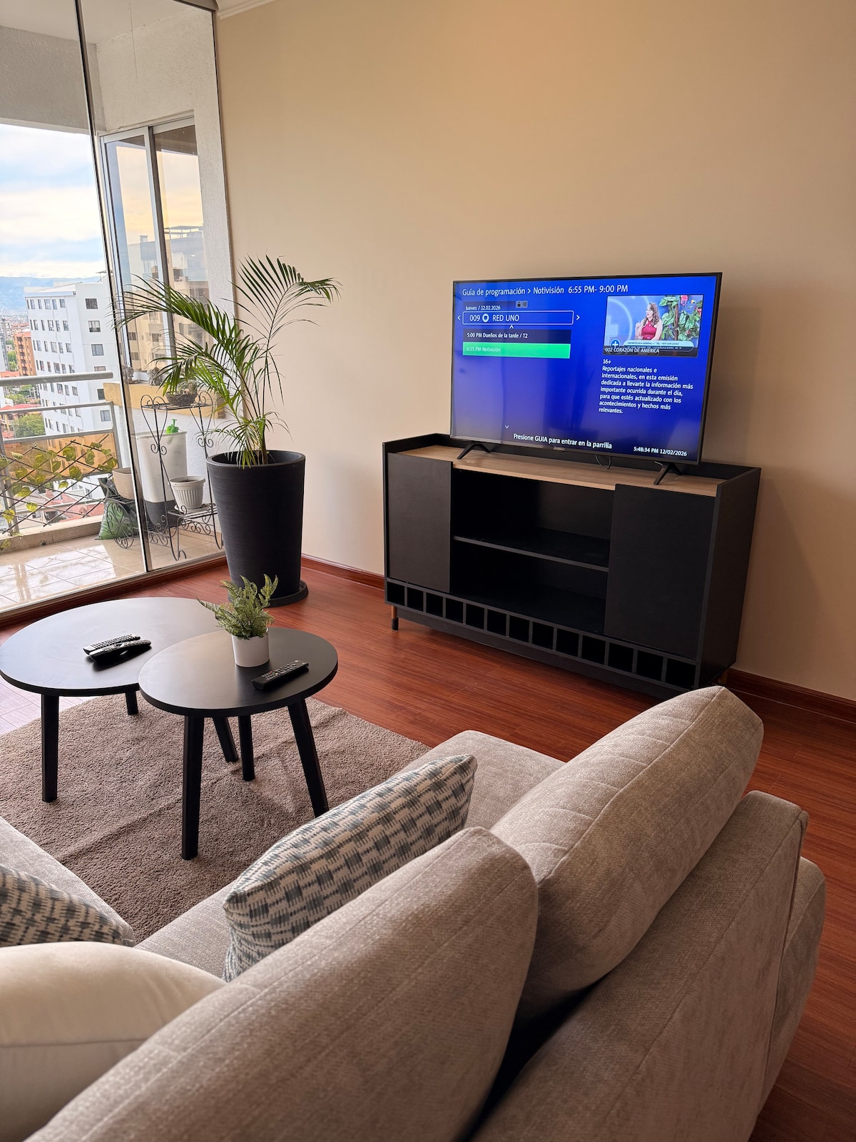 Nuevo y moderno departamento en la Avenida Principal de la mejor zona de Cochabamba . ✨ Al frente del Mejor Mall de Cochabamba, y rodeado de restaurantes, comercios, supermercados y parques. ✨ Cuenta con 2 habitaciones con cama Queen y un sofá cama de 2 plazas. ✨ Cuenta con cocina equipada con refrigerador, microondas y horno. ✨ Wi-Fi de Fibra Óptica, Televisión Inteligente, Alexa ✨ Áreas comunes (Previa Consulta): Terraza con Piscina con la mejor vista panorámica, Gimnasio, Parrilla.