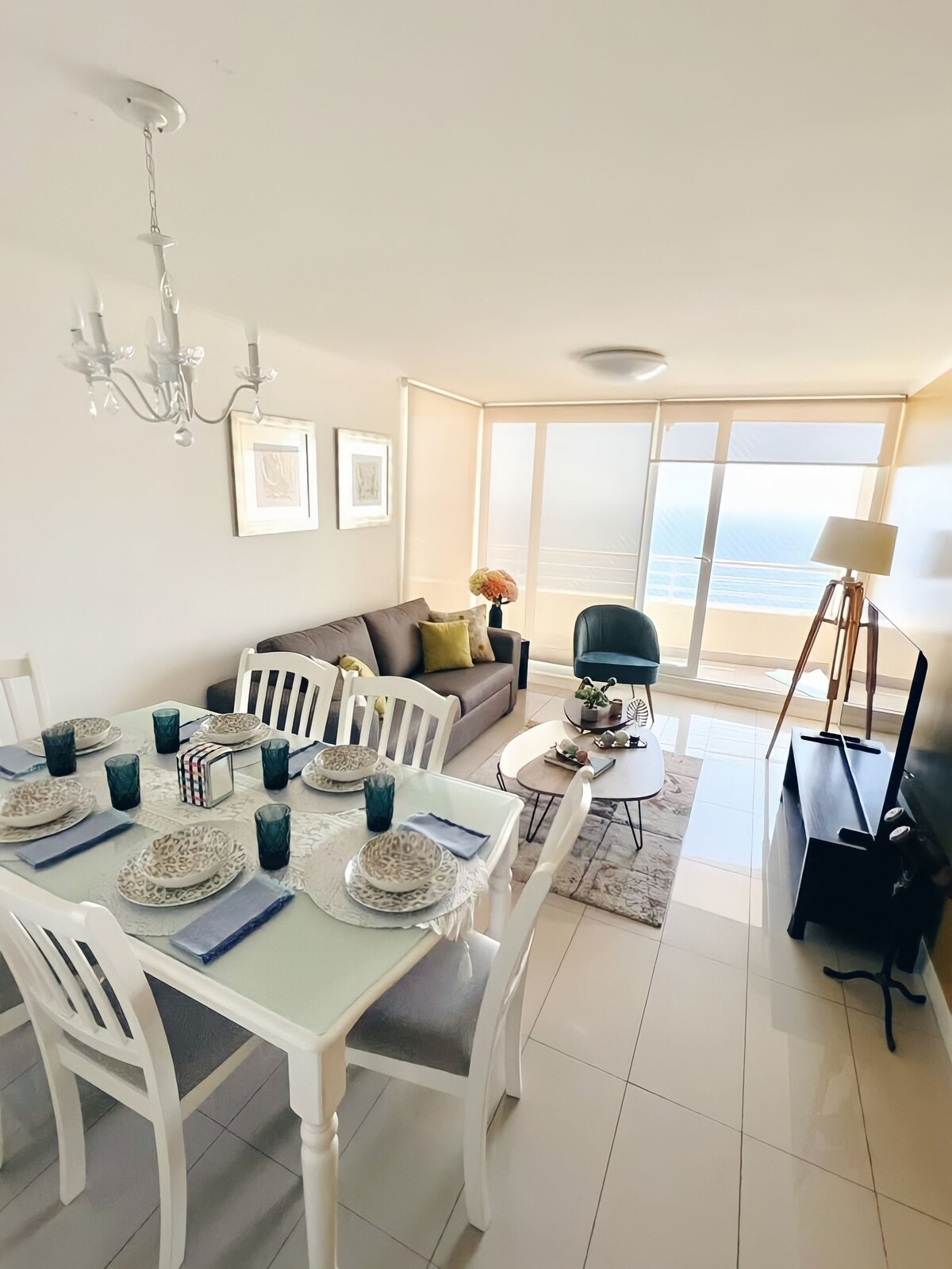 Bienvenido a "Oasis Costero". Un departamento nuevo, completamente equipado, en primera línea con vista al mar en Concón. - Piscina al aire libre de Noviembre a Marzo - Estacionamiento privado. - Amplia terraza con vista al mar equipada de parrilla eléctrica. - Incluye ropa de cama y toallas. - WiFi y Smart TV. - Cocina completamente equipada. - Sector seguro y tranquilo. - A sólo pasos de Playas, Restaurantes y Ciclovías.