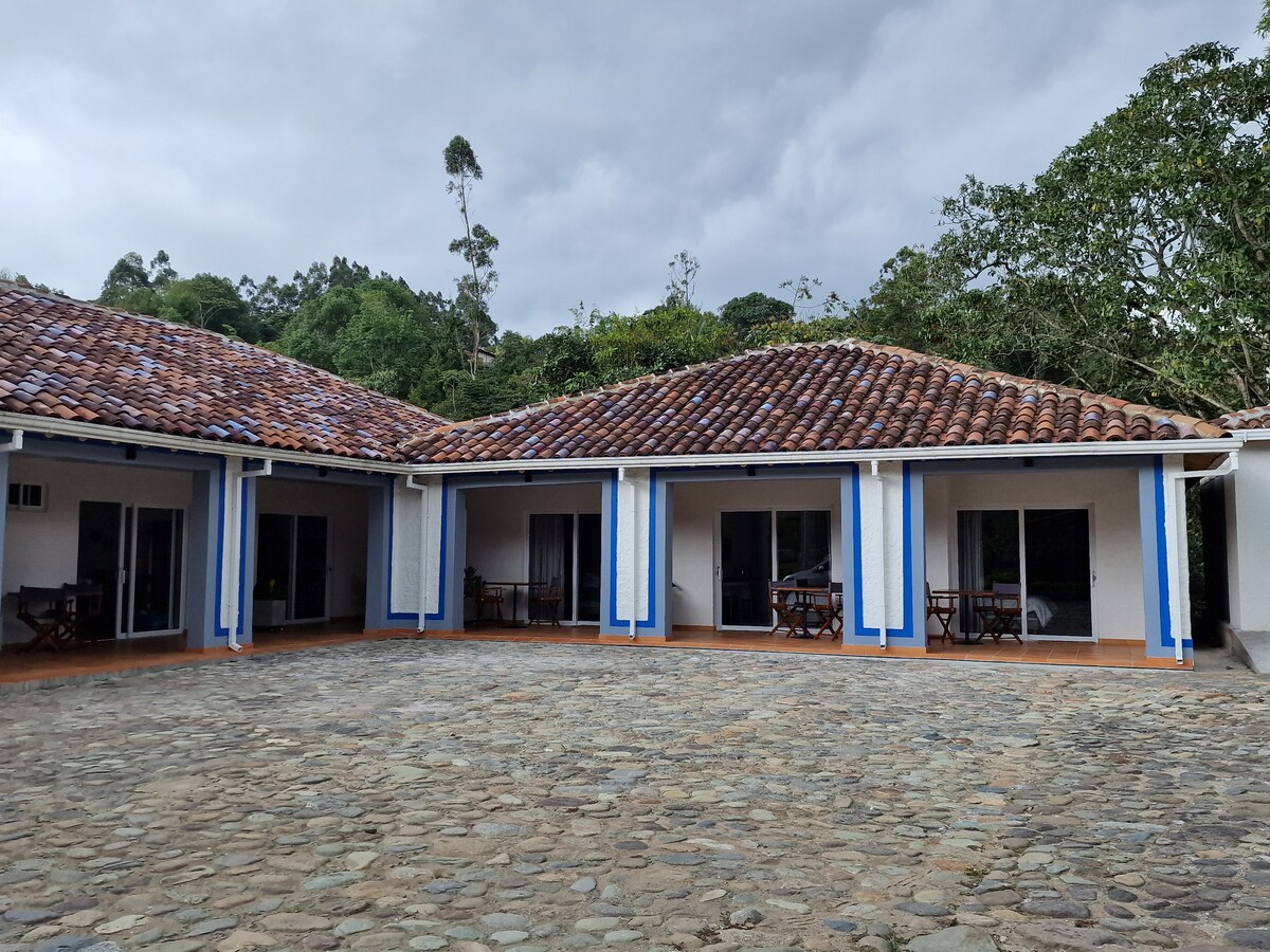 Habitación amplia y luminosa, ubicada en el segundo piso de nuestra finca cafetera. Cuenta con cama queen, baño privado con agua caliente, TV, minibar y detalles de confort que harán tu estancia inolvidable. Disfruta del tour del café: recorre los cafetales, cada etapa del grano y degusta café fresco mientras te relajas en la naturaleza. Podrás explorar nuestros jardines, cultivos y el sendero ecológico, todo acompañado de un servicio cálido y personalizado que te hará sentir como en casa.