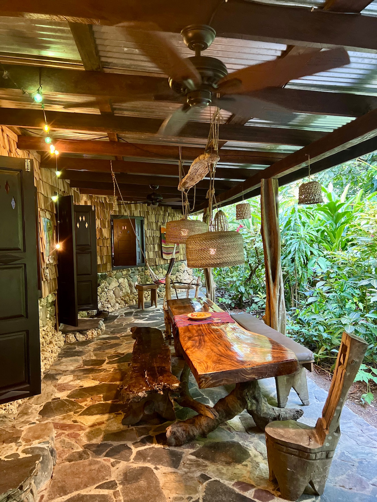 Stay in a whimsical bungalow under the trees, designed to bring the outside in. The walls of the home are semi-enclosed halfway up and screened above, making your stay comfortable and luxurious yet full of nature which is why we all enjoy Bocas. Offering a fully equipped kitchen, two queen size bedrooms, large main living area and creative stone and seashell shower. Here you can enjoy silence in nature. From your front door, walk 50 feet to the sea and relax or surf at Tigertail beach.