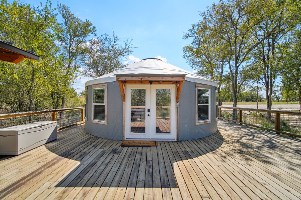 ¡Te damos la bienvenida a 969 River Yurts! Conéctate con la naturaleza mientras experimentas el glamping en su máxima expresión. Esta yurta con aire acondicionado se encuentra en una gran terraza de madera con vistas al río Colorado y comparte 13 acres privados con solo 1 yurta más (también disponible para alquilar). A 30 minutos del aeropuerto y a menos de 10 minutos del centro de Bastrop. ¡Cada unidad cuenta con un baño completo, cocina pequeña, chimenea, parrilla para barbacoa y mucho más! Disfruta de una escapada romántica en los árboles con una puesta de sol en el río.