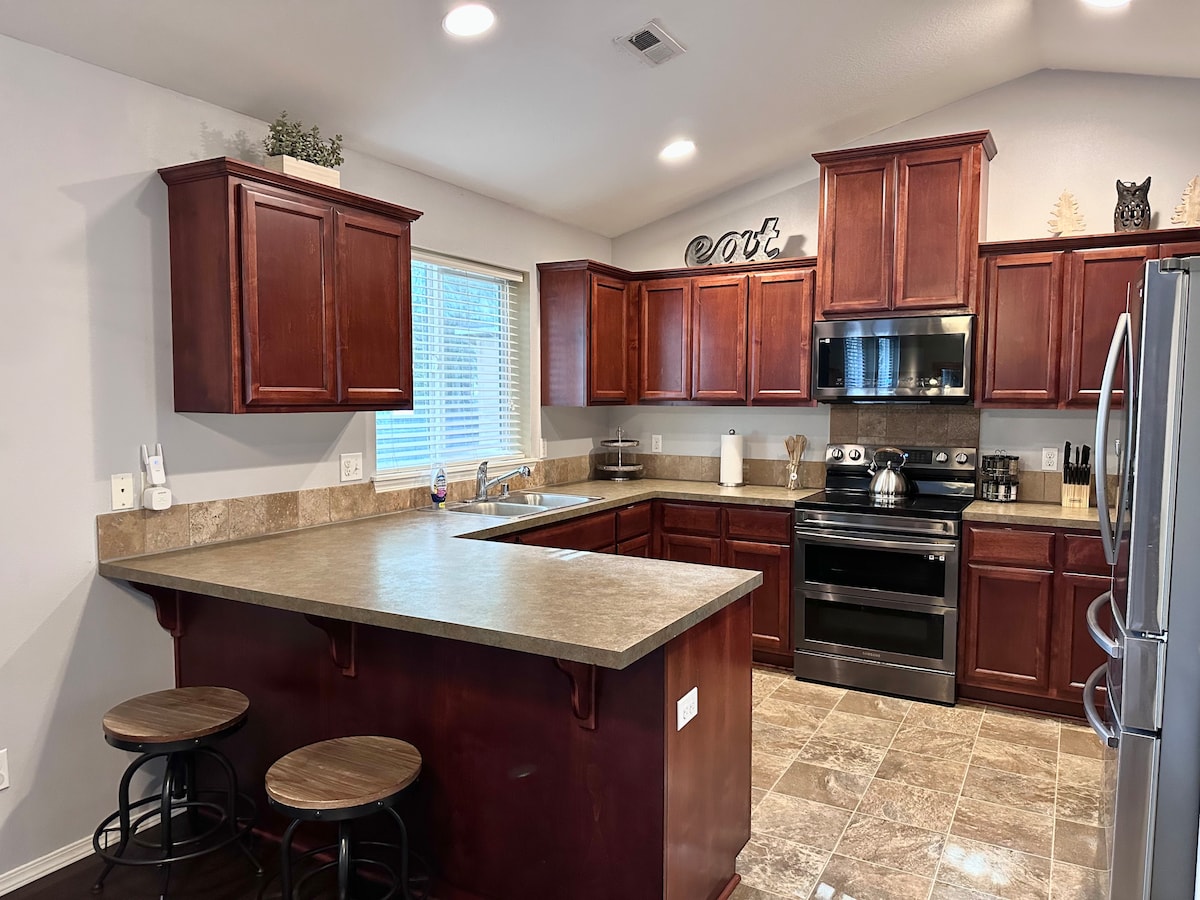 ¡1/2 milla de la I-5! Relájate en esta casa tipo spa con una cocina totalmente equipada y parrilla al aire libre. Jacuzzi privado bajo un cenador, chimenea al aire libre, barbacoa y patio cubierto con luces de cuerda y asientos para todos. Cada ducha tiene un gran cabezal de ducha de lluvia y el principal tiene calentador de toallas para esas mañanas frescas. Siéntate y ve tu película favorita en la pantalla de 80pulgadas en la sala de estar con sonido envolvente. ¡Sillón de masaje de gravedad cero! ¡Mesa de billar y tablero de dardos en la sala de juegos del garaje! Capacidad para 5 personas. Todas las habitaciones tienen televisores inteligentes.