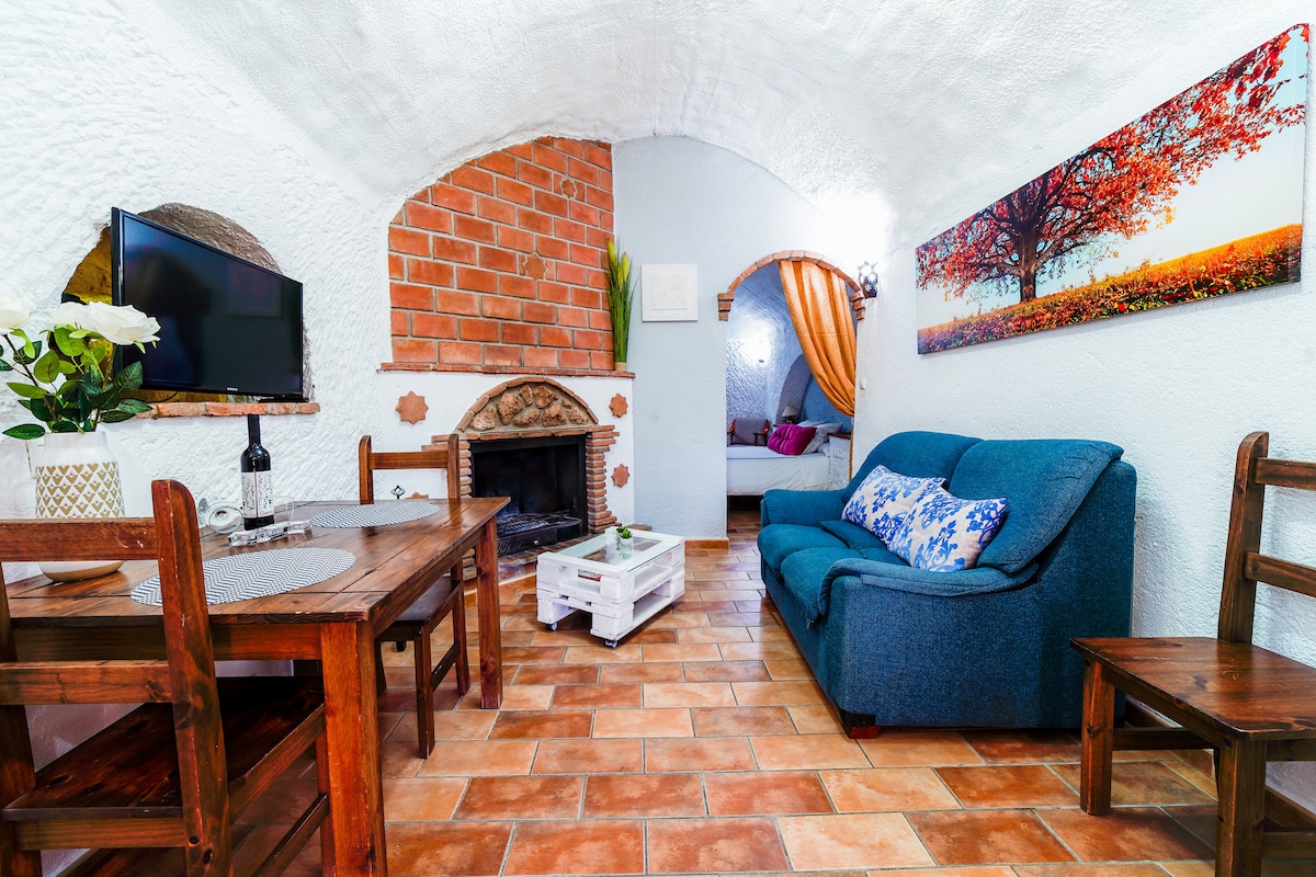 Cueva para 2 personas con salón cocina con chimenea, un dormitorio, baño, patio, jardín , mobiliario de jardín, piscina exterior( en verano ),zona de barbacoas , parking gratis y wifi gratis en zonas comunes. Temperatura todo el año entre 18 y 20 grados.