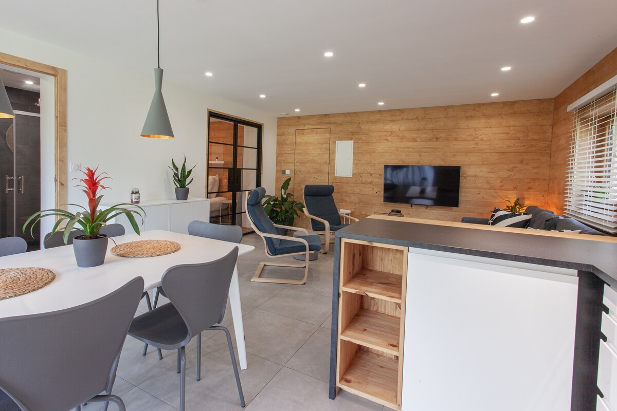 Le Moulin des Olirics vous accueille dans un style contemporain avec un maxi de 4 personnes. Cet appartement de 60m2 situé à 15 min de voiture de Combloux-Megève, 30 min de Chamonix et 1h de l'aéroport de Genève. Il dispose d'une cuisine aménagée ouverte sur un salon-salle à manger avec TV et canapé-lit, 1 chambre, 1 salle de bain avec douche à l'italienne ainsi qu'un WC indépendant. Le linge de maison et de toilette seront mis à votre disposition. La Wi-Fi est en accès libre et gratuite.
