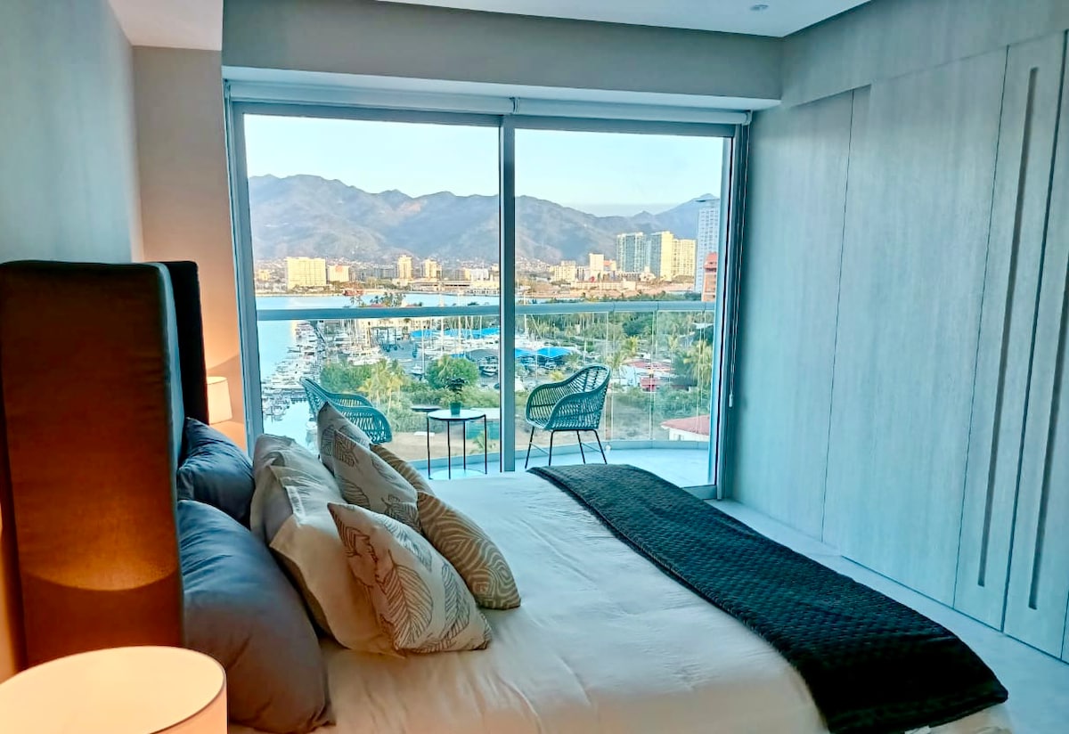 Disfruta del lujo y la comodidad en el corazón de Marina Vallarta. Ubicado en el piso 7, este exclusivo condominio ofrece una experiencia funcional y moderna con una de las mejores vistas de la región. Desde tu balcón privado, podrás contemplar el movimiento de los yates, la iluminación nocturna de la marina, el despegue de aviones y la majestuosa Sierra Madre. • Espacios Integrados: Una sala luminosa con Smart TV de 65” que conecta con una habitación principal equipada con cama King Size