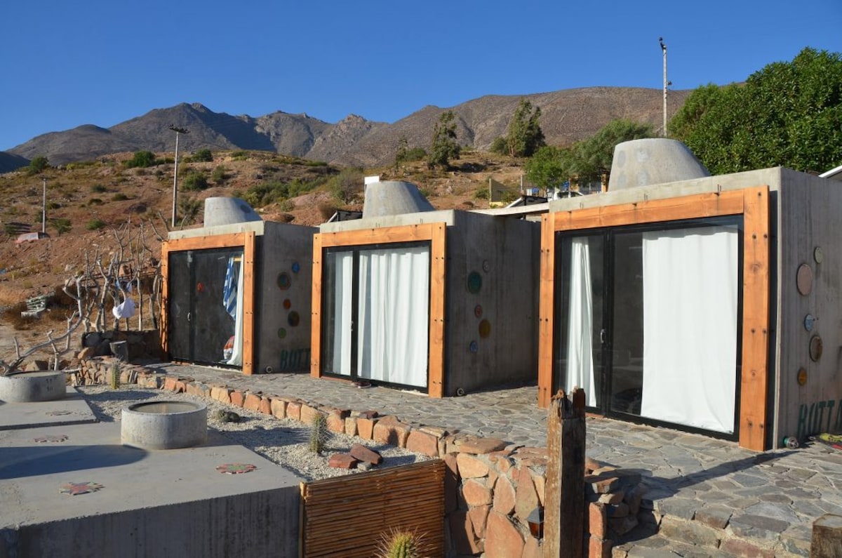 Departamento de piedra para 2 personas (comparte sitio de 1500mts2 con otros 2 departamentos), living, comedor, cocina, 1 baño, 1 cama matrimonial, 1 cama pequeña una plaza, terraza, parrillas, estacionamiento ,columpios, amplios jardines y mirador. Ideal de base para visitar atractivos turísticos de la 4ta región tales como: Puerto Aldea, Coquimbo, La Serena, Valle del Elqui, Observatorio Mamalluca, Isla Damas, Parque Nacional Fray Jorge y Pisqueras de la zona.