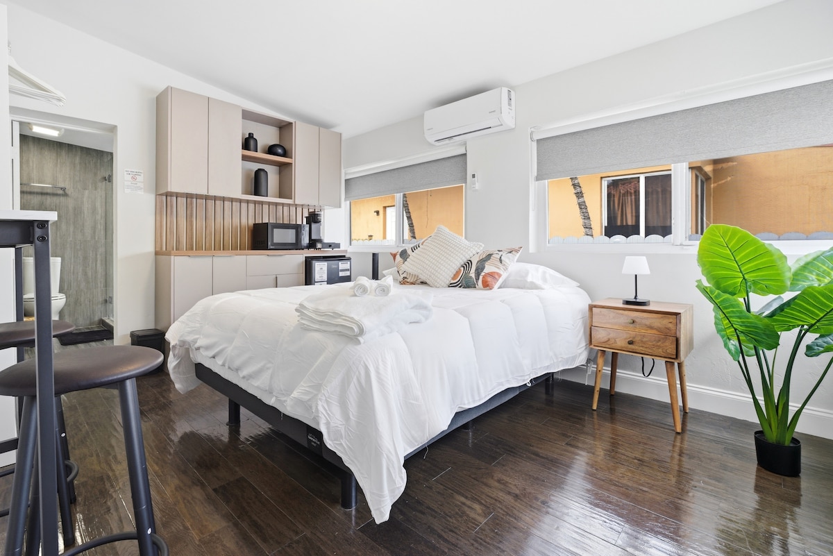 Disfruta de la combinación perfecta de confort moderno, estilo y sostenibilidad en este estudio completamente renovado de 600 pies cuadrados. Con una cómoda cama queen, un sofá cama acogedor y una cocina totalmente equipada, aloja hasta 3 huéspedes con total comodidad. Diseñado para brindar privacidad y relajación, es ideal para viajeros de ocio o negocios. A solo minutos de las principales atracciones y playas de Miami. ¡Reserva ahora y vive una experiencia inolvidable!