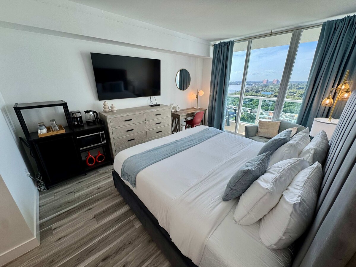 ¡INCREÍBLE VALOR! Primero, ¡una tarjeta de regalo de 30 dólares para nuestro restaurante GreenStreet y una botella de champán te estarán esperando en tu habitación! En Coconut Grove, este estudio de lujo esquinero de propiedad privada y renovado en el piso 17 de una lujosa propiedad frente al mar ofrece impresionantes vistas de la ciudad y la bahía. El estudio es muy espacioso y está totalmente equipado para 2 personas con cocina completa, cama tamaño king y baño completo. Disfruta de todas las comodidades de lujo que ofrecemos, piscina y jacuzzi con increíbles vistas a la bahía, gimnasio completo en el ático, seguridad las 24 horas.